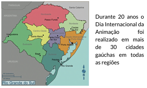 O Dia Internacional da Animação já exibiu as mostras de curtas metragens de animação nacionais, internacionais e infantis em diversas cidades do estado de Rio Grande do Sul e do Brasil simultaneamente. As mostras, que acontecem sempre no dia 28 de outubro de cada ano, já foram exibidas em cerca de 30 cidades gaúchas nestes 20 anos.